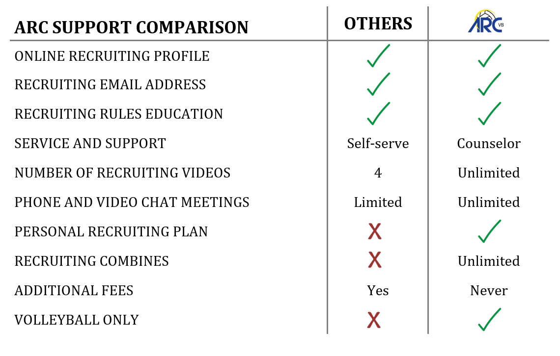 Schedule your Free Membership Evaluation Click Here Exclusive Recruiting Counselor. Unlimited phone/video chat appointments with your Counselor. Unlimited Recruiting Videos. Complementary registrations for Championship Combines events. As desired text and email communication with your Counselor. Personalized Recruiting Plan. Schedule your Free Membership Evaluation Click Here Exclusive Recruiting Counselor. Home Visit to discuss your Recruiting Goals. Unlimited phone/video chat appointments with your Counselor. Complementary registrations for Championship Combines events. As desired text and email communication with your Counselor. Personalized Recruiting Plan. Player Profile Recruiting Page. Unlimited College Coach outreach by your Counselor. Recruiting email address. Skills evaluation and development plan. Personal support to help your family make the best collegiate and volleyball decision! Schedule your Free Membership Evaluation ARC Membership Benefits Unmatched College Volleyball Recruiting Support and Education. Player Profile Recruiting Page. Unlimited College Coach outreach by your Counselor. Recruiting email address. Skills evaluation and development plan. Personal support to help your family make the best collegiate and volleyball decision! Click Here Schedule your Free Membership Evaluation ARC Membership Benefits Unmatched College Volleyball Recruiting Support and Education. ARC Membership Benefits Unmatched College Volleyball Recruiting Support and Education. Exclusive Recruiting Counselor. Unlimited phone/video chat appointments with your Counselor. Unlimited Recruiting Videos. Complementary registrations for Championship Combines events. As desired text and email communication with your Counselor. Personalized Recruiting Plan. Player Profile Recruiting Page. Unlimited College Coach outreach by your Counselor. Recruiting email address. Skills evaluation and development plan. Personal support to help your family make the best collegiate and volleyball decision! Schedule your Free Membership Evaluation Click Here Athletic Recruiting Counselors